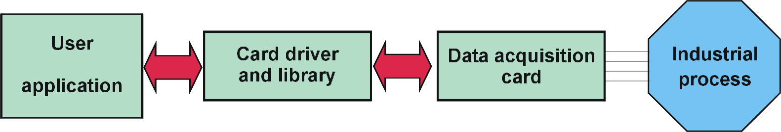 In order to understand the simulator, let me to explain its philosophy. Figure 1shows the components of a computer based industrial control system that uses a data acquisition card. In general, the software application interacts with the data acquisition card through drivers provided by the card manufacturer. In the case of Microsoft Windows, these drivers are usually dynamic link libraries (DLL) or ActiveX library (OCX). The card is directly controlled by the drivers, which have access to its registers. Finally, the card is connected to the industrial process through electrical connections by appropriate sensors and actuators.