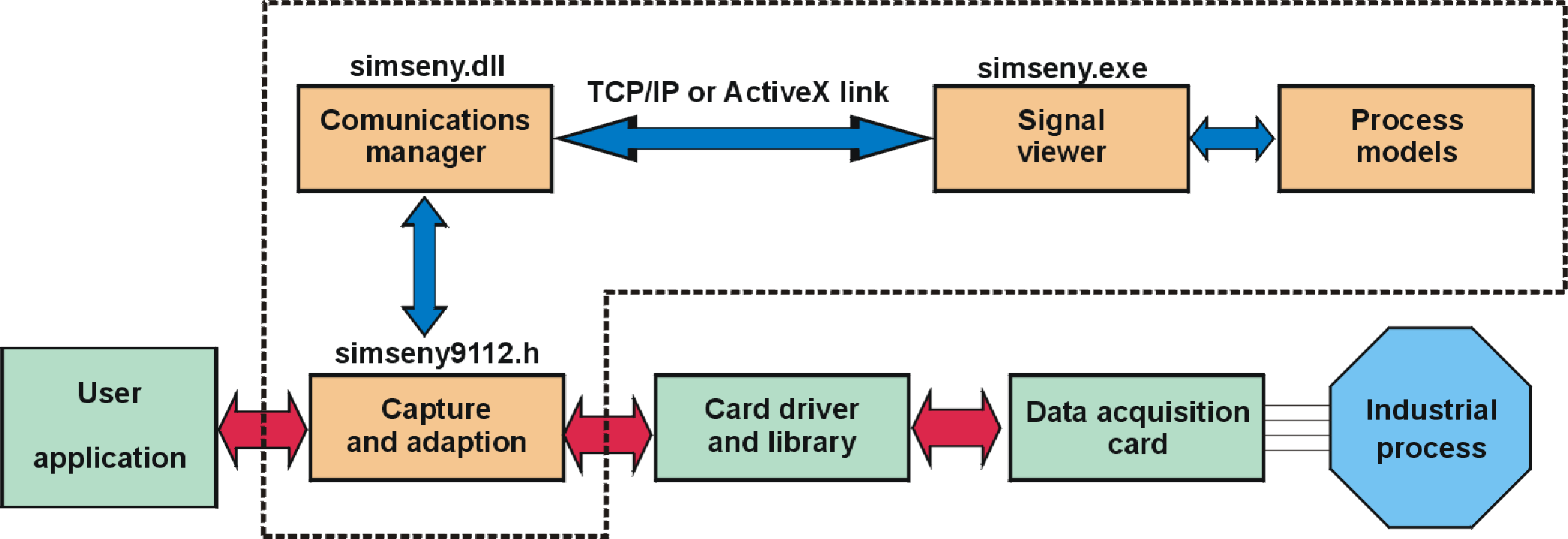 Figure 2 shows a diagram of the blocks that form the simulator and how they are inserted in the industrial control system. The main idea is to capture all the calls to the functions of the card library and decide if they are to be directed to the simulation system or, again, to the data acquisition card.