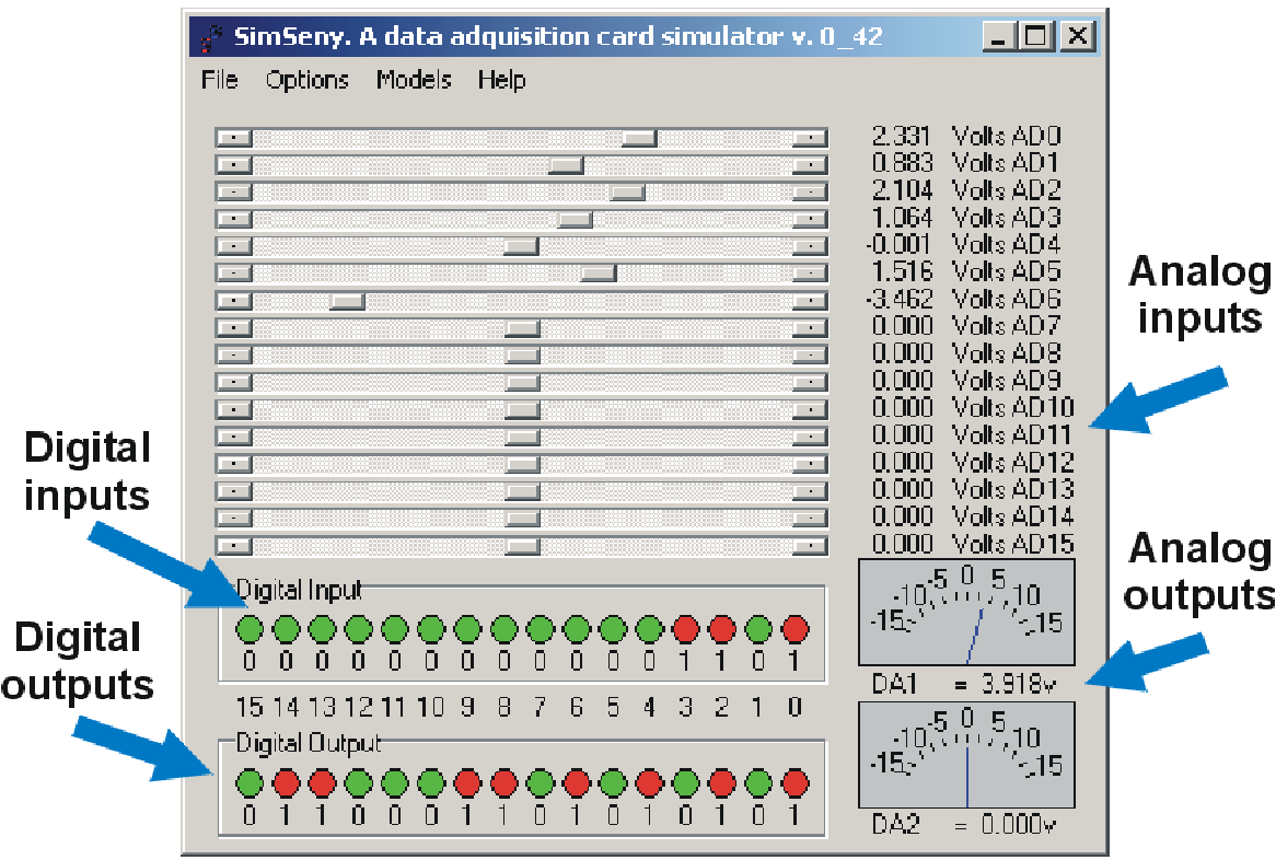 Figure 5 shows the SimSeny simulator signals viewer (simseny.exe) in operation. The simulator tries to imitate the acquisition data card at the electronic signals level that are available through its connectors. The viewer permits physical outputs to be shown and physical values to be entered in the simulated data acquisition card inputs, both for digital and analog signals.